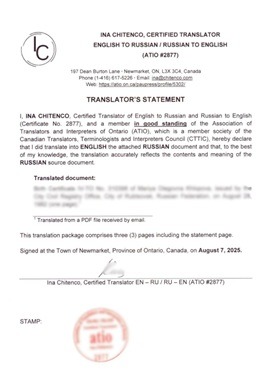 Если вы готовите документы для канадских организаций или учреждений или для консульства РФ в Торонто, вам, скорее всего, потребуется сертифицированный перевод. Такие переводы необходимы для иммиграции, учебы, получения водительских прав, оценки образования и получения консульских услуг. Правильно выполненный перевод экономит время и гарантирует, что ваши документы будут приняты без задержек.